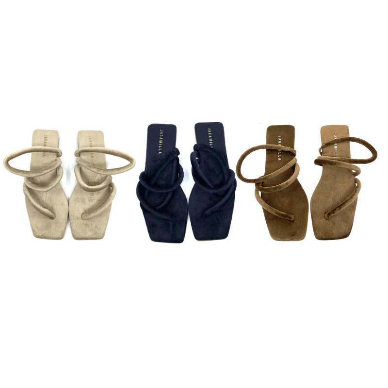 Sandalias con un diseño exclusivo que brinda sofisticación a tu pie, creando una silueta estilizada y elegante. Un modelo sexy que combina comodidad y distinción, perfecto para un look fresco y trendy. Capellada en velvet lavable, suave y resistente. 100% veganas. Tacón de 1 cm.