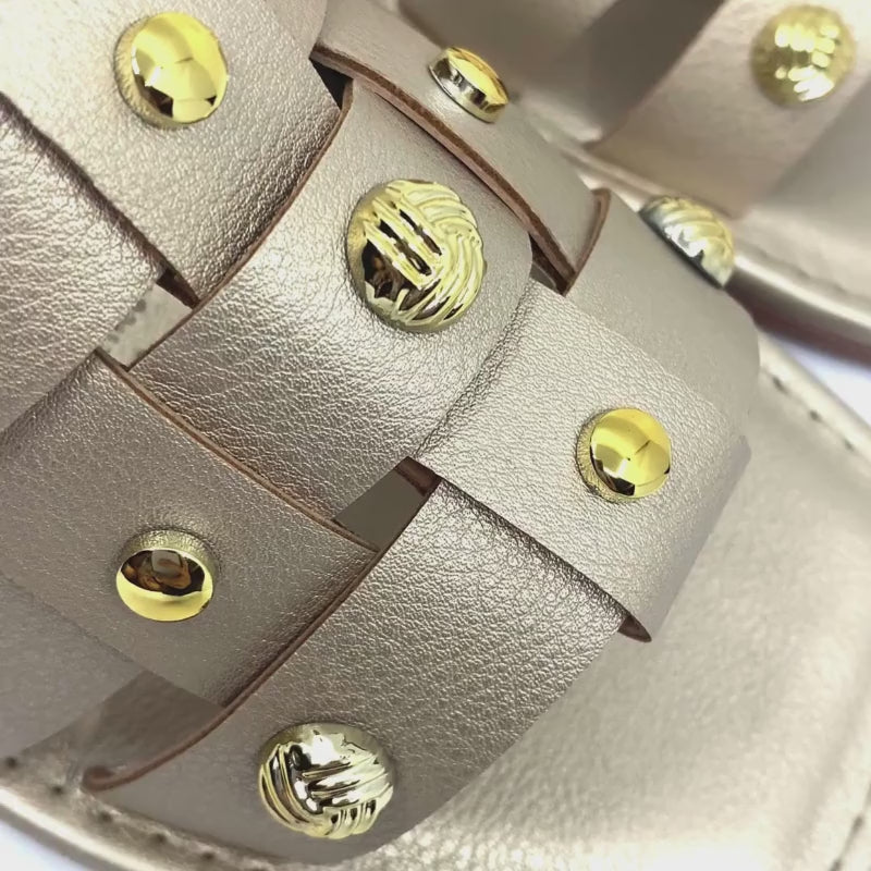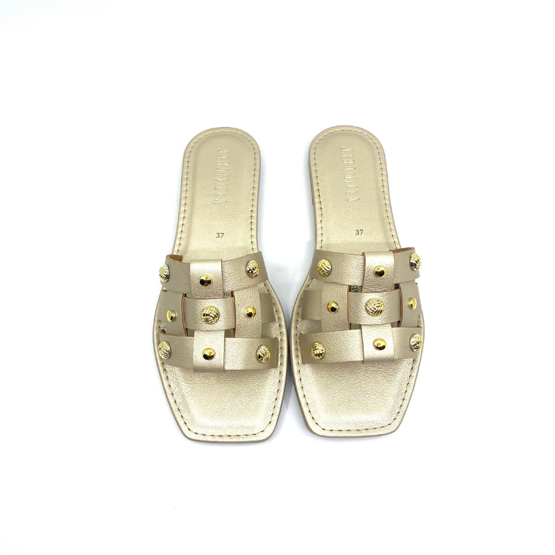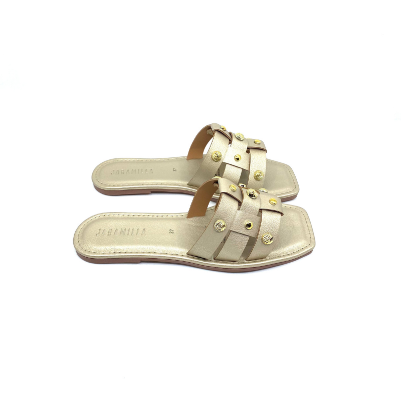 Sandalias planas en poliuretano, decoradas con taches que añaden un toque moderno y cool. Perfectas para un look casual con un toque trendy. Tacón de 0.5 cm.